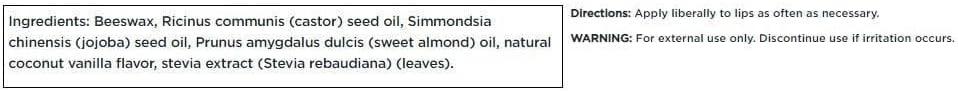 Vanilla and Coconut Lip Balm combines the natural moisturizing power of sweet almond oil and jojoba oil with a protective beeswax base that seals in moisture and locks out the elements. Featuring pleasant-tasting natural coconut and vanilla flavoring and sweetened with stevia leaf extract, it's sugar free and contains no artificial colors, flavors or additives of any kind.